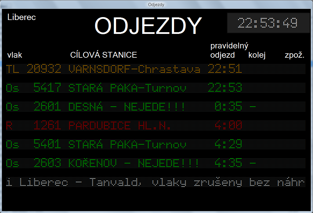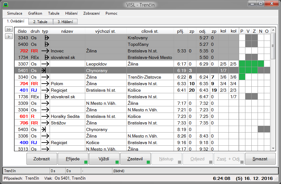 - Základní hlášení vlaků – přijede, zastavil, zpoždění, …